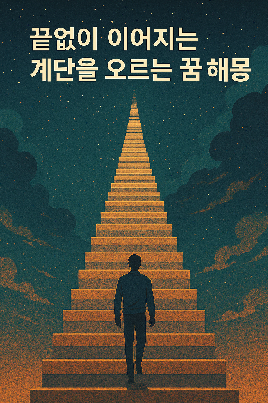 끝없이 이어지는 계단을 오르는 꿈은 삶의 도전, 성장, 불안, 기대를 동시에 담고 있는 상징적인 꿈입니다. 오르는 과정이 힘들든 즐겁든, 그 자체가 곧 인생의 여정을 반영한다고 볼 수 있습니다. 이 꿈을 꿨다면, 지금 하고 있는 일에 더 큰 의미가 있음을 깨닫고 꾸준히 정진하라는 메시지일 수 있습니다. 또한 방향성이 흐려진 경우, 목표를 재정립하고 스스로에게 필요한 휴식을 챙기는 지혜가 필요합니다. 결국 이 꿈은 “당신의 여정이 아직 끝나지 않았으며, 계속 나아가야 한다”는 무의식의 목소리입니다.