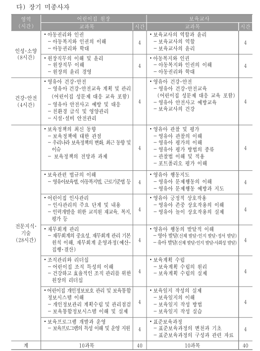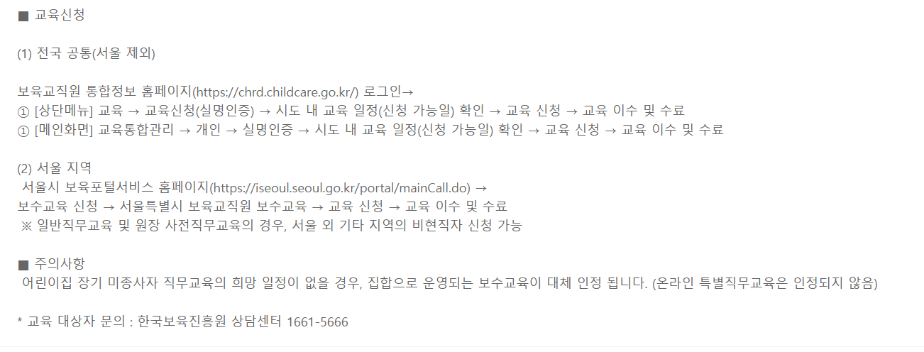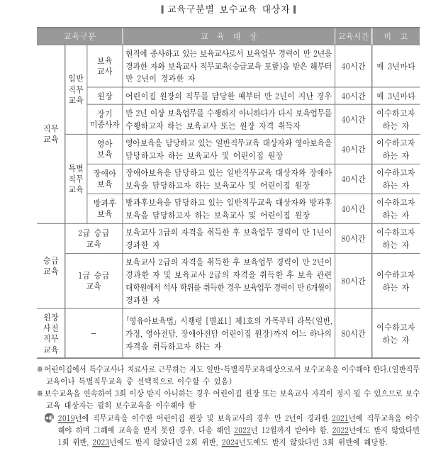 - 다만, 장기 미종사자가 다시 보육업무를 수행하기 이전 만 2년 이내의 기간 동안 집합 보수교육을 이수한 사람은 장기 미종사자 교육을 이수한 것으로 봅니다.