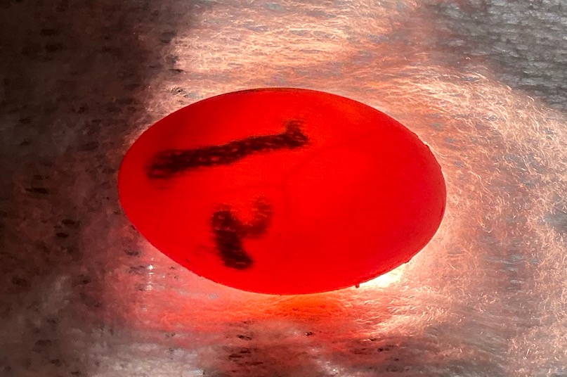 다음으로 확인한 것은 8월 2일에 산란된 알입니다. 이 알은 빛을 비추었을 때 선명한 붉은 빛과 함께 혈관이 뚜렷하게 드러났습니다.